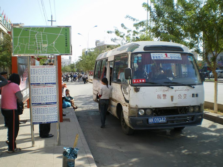 我們先把背包存放好,稍作打聽,在不遠的地方有公交可以前往吐魯番市區,於是我們前往搭乘。沿途許多路段都還在修,都是土路,也難怪為什麼要一個多小時了。