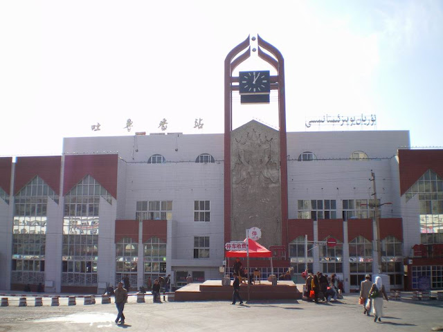 買好票後,我們環顧火車站四周環境,有點出乎我意料之外,人不多,四周挺冷清的。吐魯番火車站是在一個叫作〝大河沿〞的地方,離吐魯番市區還要一個多小時的車程!沒想到火車站建得離市區這麼遠的,這真的是我始料未及的。
