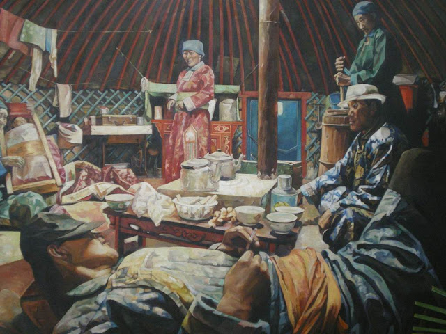 這也是其中一幅畫作,畫的是蒙古包裡的景象。