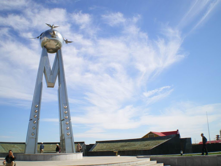上到國門高處,看見遊客圍繞著界碑,而遠方的城鎮就已經是俄羅斯了,可以透過望遠鏡看到對面的俄羅斯人。