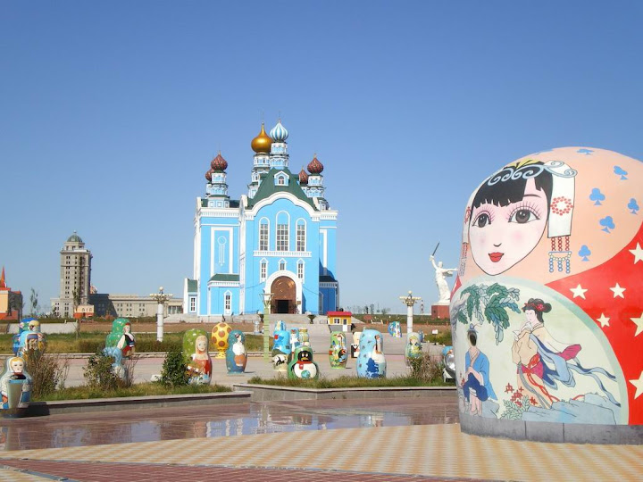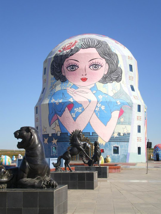 正中央的最大的套娃高約30米,有三個面,分別代表中國、蒙古,俄羅斯,其中這一面是中國。