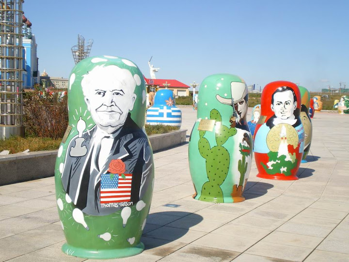 廣場相當多的小套娃,時常都是名人面孔,像最左邊的就是〝發明大王─愛迪生〞。
