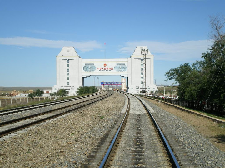 鐵路這頭的是『中華人民共和國』,對面的那頭是...『POCCNR』後面兩個字母是俄文。