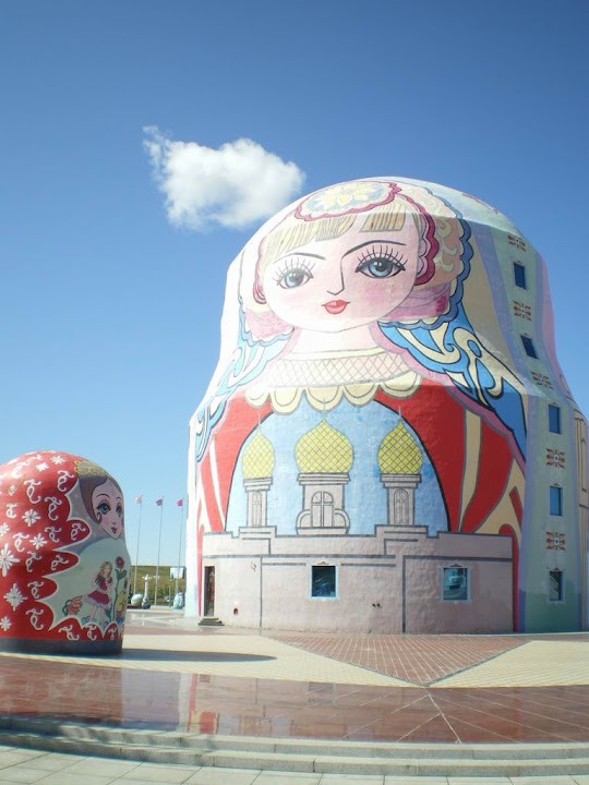 我們抵達套娃廣場,這個廣場挺大的,參觀不用門票,只有進廣場裡的一個博物館才要門票。這個廣場散佈著大大小小的套娃,一些較大的套娃其實是商店,裡面賣的當然就是各式各樣的套娃了。