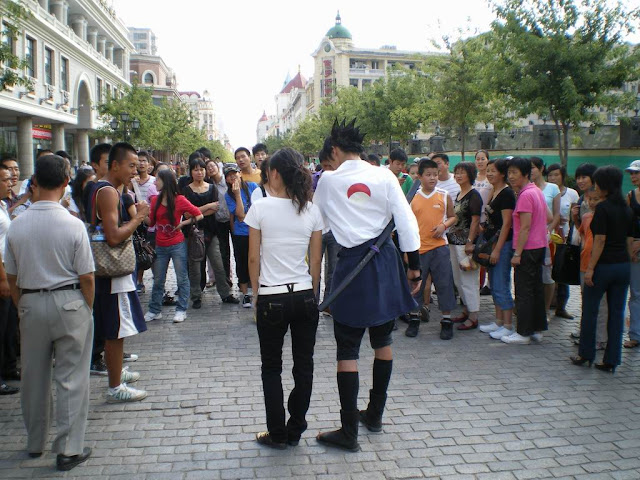 cosplay即是角色扮演,許多人喜歡扮演動漫畫中或是電玩遊戲中的角色,是一種由日本那邊風行過來的活動,在台灣特定場合也看得見,只是我沒想到在中國的中央大街可以看得見cosplay,雖然只有一個人,但看得出似乎越來越多年輕人敢勇於表現自我了。