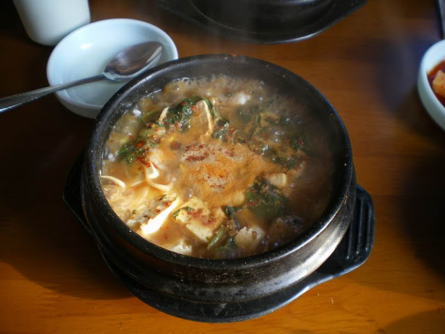 我們進到飯館,拿起菜單,才在思考著覺得價格都蠻貴的,突然男老闆走過來,拿給我們另一份菜單,說:〝這份才對。〞,我才領會到一件事,我問老闆:〝那是給韓國人看的菜單吧?〞,老闆笑而不答,原來如此呀,看來韓國人想要在中國道道地地的旅遊是一件不容易的事,除非好好的學習中文吧。